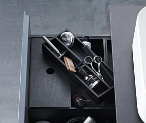 Fackindelad lådinsats eller smyckeskin i svartbetsad ek. Med tillhörande lock.